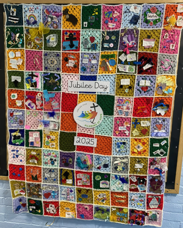 Throughout Jubilee Year, we made our very own Jubilee pledges, a shared commitment to honour our past, celebrate the present, and work together to build a hopeful future for all. To support our Pilgrims of Hope Journey, we focused on monthly themes throughout the year based around the theme of hope. On Jubilee Day in June, pupils from St Mary’s, proudly captured our thoughts for the Jubilee Year of Hope using fabric and haberdashery. The children, supported by their grown ups, created a ‘square of hope’ and these were assembled to make our Jubilee Blanket which takes pride of place near the entrance to school.